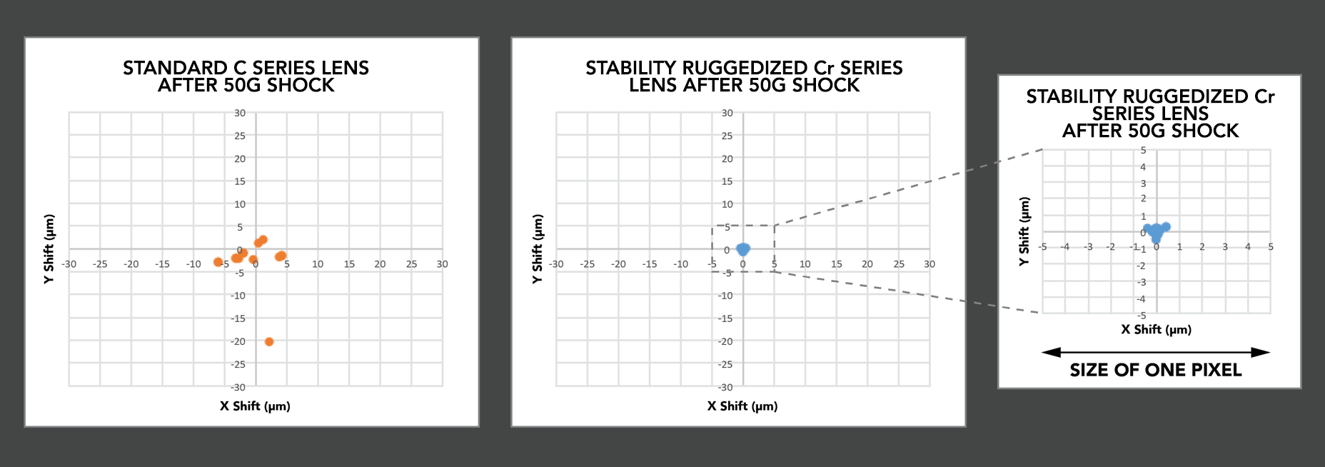 穩定性加固保證了光學指向的穩定性,並在衝擊後保持定位。除用簡化的對焦機制替換光圈外,各鏡頭的內部元件均用膠合固定,以防止在外殼中移位。