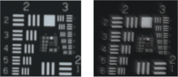 USAF 1951測試板將較高分辨率的單元置於中心,的確具有一些缺點。例如,鏡頭會在視場中心和邊角處產生不同級別的分辨率。大多數情況下,遠離視場中心會造成分辨率降低,因此在不同位置檢查分辨率和對比度變得很重要。這需要將測試板重新定位在視場周圍,並拍攝更多圖像以全面評估系統效能,因此會增加測試時間。根據系統是僅聚焦在視場中心還是聚焦在整個視場內,這也會帶來一些問題; 由於分辨率因位置而異,因此難以確定整個視場何時處於最佳焦點。一些鏡頭在視場中心可取得很高的分辨率,但當鏡頭和相機系統在圖像中心聚焦時,視場邊角處的分辨率卻很低。鏡頭均焦調焦以平衡整個視場內的分辨率,但通常會降低中心分辨率。不過,降低中心分辨率並不一定是壞事,因為鏡頭即使在達到平衡焦點時,仍能很好地滿足應用要求(圖3)。