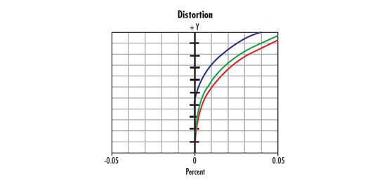 透過非遠心鏡頭對測試板成像時,在圖像底部,垂直線之間的距離將會減小,此影響稱為梯形畸變。完美的遠心鏡頭不會產生梯形畸變,遠心度將是0° (圖 10).