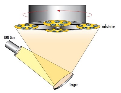 圖 5:IBS 是可高度控制的製程,其中利用高能量離子槍,讓材料從目標噴濺到旋轉中的基材,產生非常精準及可重複的光學鍍膜