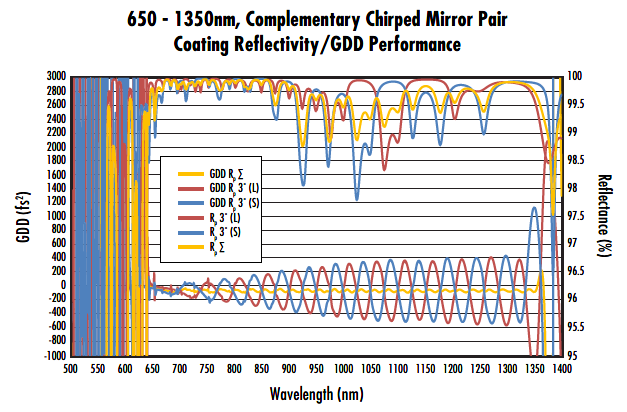 圖 6: 高色散反射鏡提供大幅度負 GDD,且振盪受波長影響的情形遠低於啁啾反射鏡。