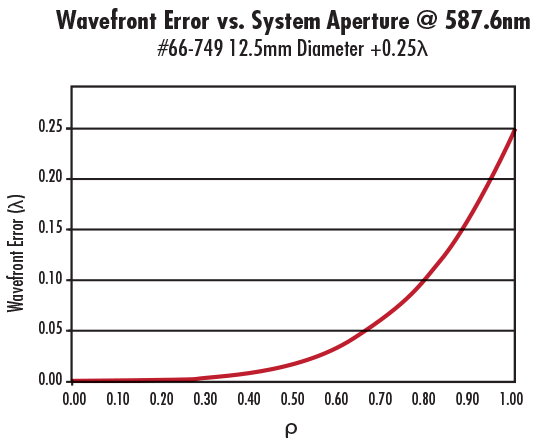 At 587.6nm, W040 is equal to the wavefront error indicated in the specifications of the individual corrector plate. For instance, for #66-749 12.5mm Diameter +0.25λ plate, W040 equals +0.25 at 587.6nm and the clear aperture (CA) is 11.25mm. It is important to note that Equation 3 is valid only when a collimated beam is incident on the corrector plate; it is not valid if the incident beam is converging or diverging. To illustrate the amount of spherical aberration generated as a function of incident beam diameter, consider #66-749 at 587.6nm (Figure 3).