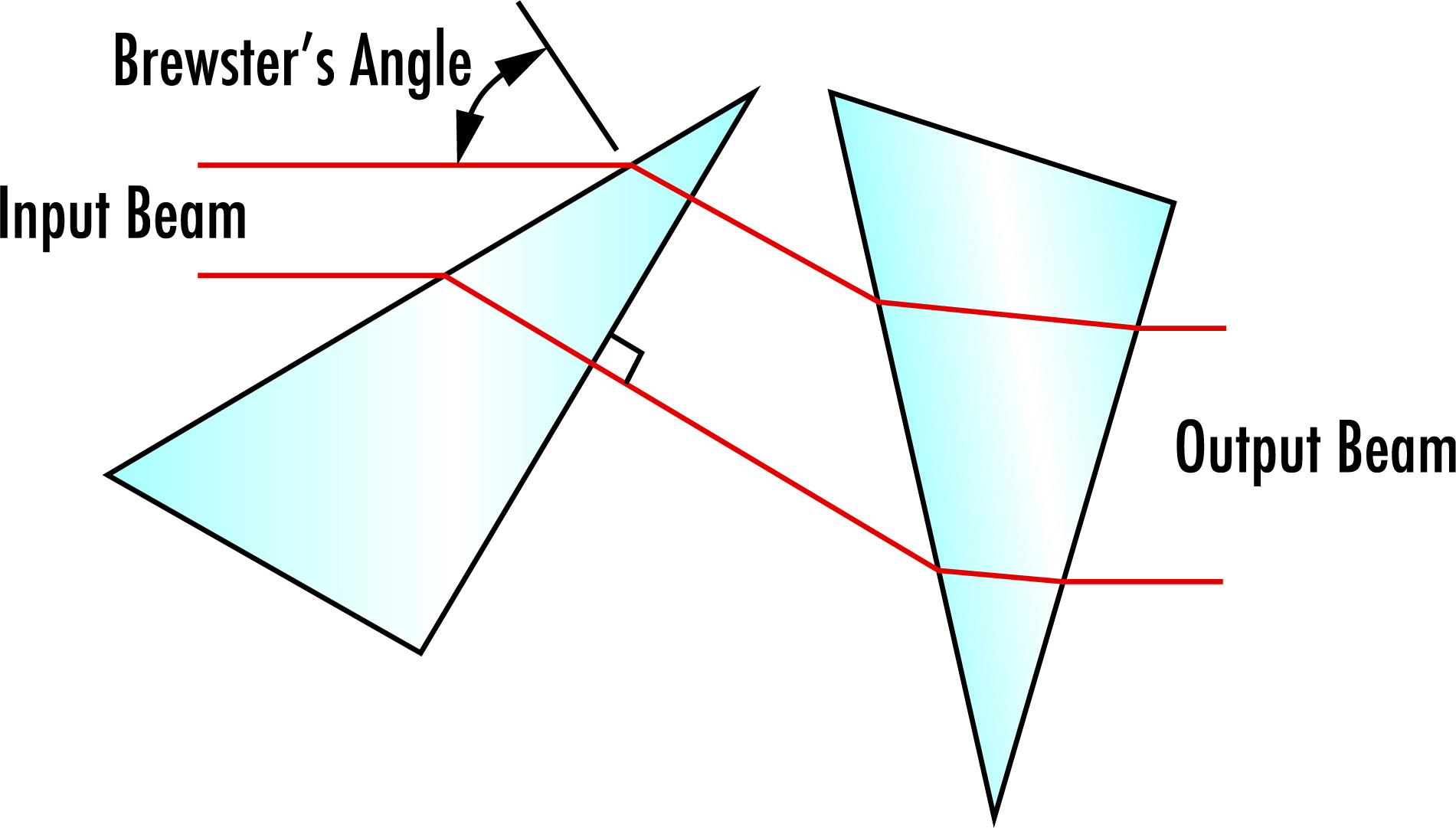 單個稜鏡雖然可以改變單軸光束半徑,但會同時改變光束傳播方向。需要成對使用稜鏡來調控光束橢圓度,同時保持原始傳播方向(圖 2)。然而,使用變形稜鏡組需要精確的角度校準。雖非必須條件,但建議將其中一個稜鏡置於布魯斯特角(即p偏振光無反射的入射角)。稜鏡的另一表面應採用垂直入射設計,並配備抗反射膜(AR鍍膜)以實現最大光通量。這種精密校準要求是客戶通常選擇預校準稜鏡組套件的主要原因。