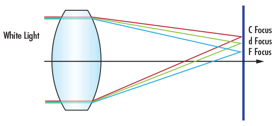 Longitudinal chromatic aberration (LCA) occurs when different wavelengths focus at different points along the horizontal optical axis as a result of dispersion properties of the glass. The refractive index of a glass is wavelength dependent, so it has a slightly different effect on where each wavelength of light focuses, resulting in separate focal points for F, d, and C light along a horizontal plane (Figure 2).