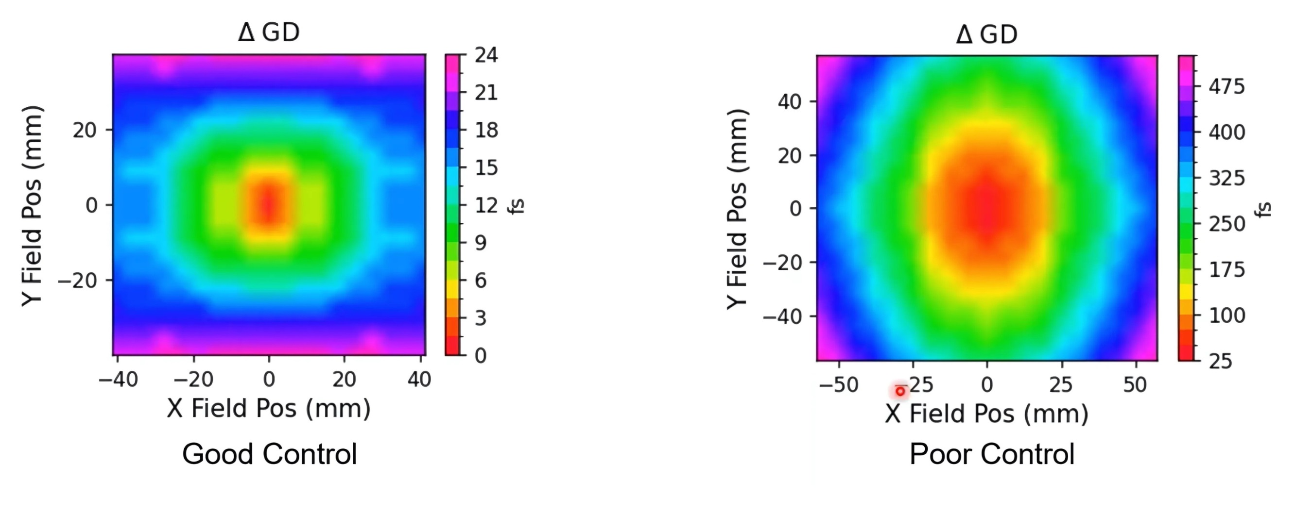 We see that an f-theta lens with good control only displays a total Δ GD of 24 fs while a poor lens has one as high as 475 fs.