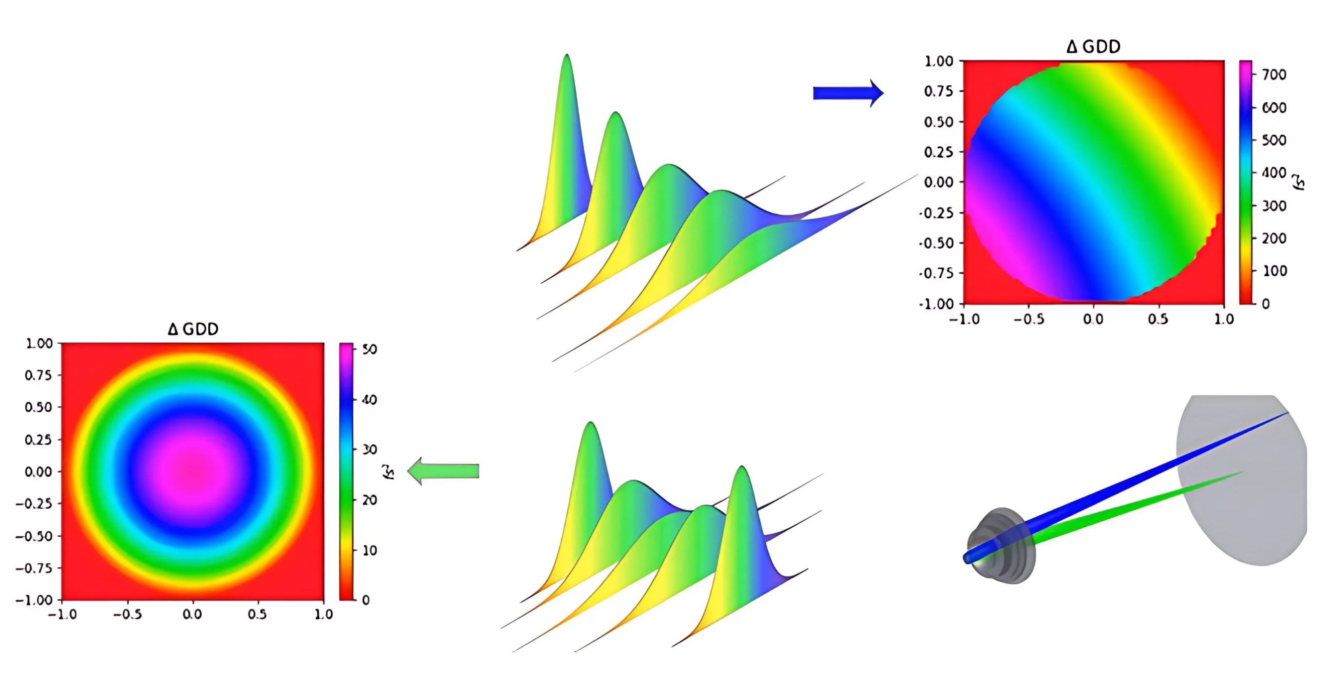 GDD quantifies how much a dispersive medium causes this pulse broadening. It is measured in femtoseconds squared (fs²). A higher GDD value indicates greater dispersion-induced broadening for a given material thickness. To mitigate GDD, designers often apply negative GDD in advance through a process known as pre-chirping. However, it is important to note that pre-chirping does not correct for chromatic aberrations within the lens itself.