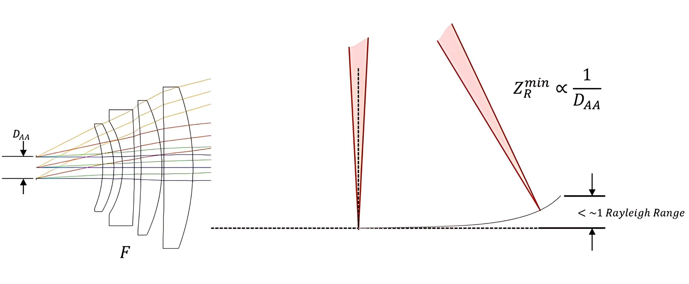 Field flatness describes how level the target surface must be for an f-theta lens to maintain proper focus across the entire scan area. Two key factors influence this: acceptance aperture and focal length. The acceptance aperture is the usable entrance pupil area of the lens through which the laser beam can pass. It determines the maximum diameter of an input beam that should enter the lens, usually mechanically restricted by an external aperture such as a scanner module. A larger beam diameter results in a smaller beam waist (the narrowest point of the focused beam). However, a smaller beam waist also reduces the Rayleigh range, the distance over which the beam remains sufficiently focused. In short, a larger acceptance aperture leads to tighter focusing, but a shorter usable range (Figure 2).