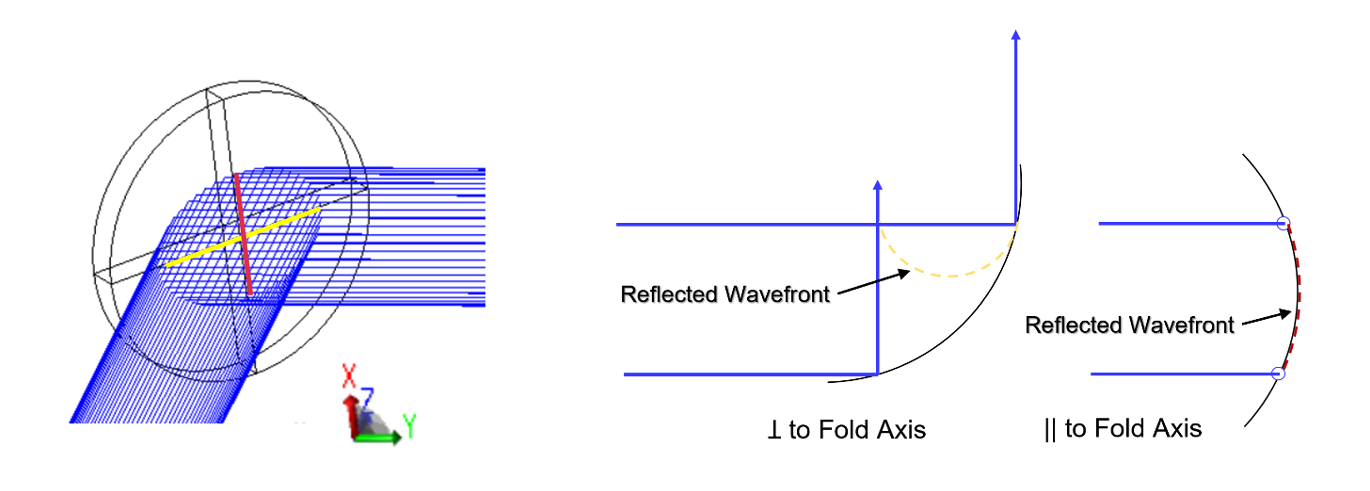 The beam width and the radius of curvature from the flatness error are constant. However, we see that the reflected wavefront ꓕ to the fold axis is projected across the curvature at the reflection angle, subjecting it to more of the optically powered surface than that || to the fold axis. Thus, the wavefront emerges with a more severe curvature. The imbalance is astigmatism, which accumulates additively at every turn mirror in this way. Furthermore, the ꓕ direction will accumulate optical power regardless of the reflection direction, so long as the beam lies in a single plane.