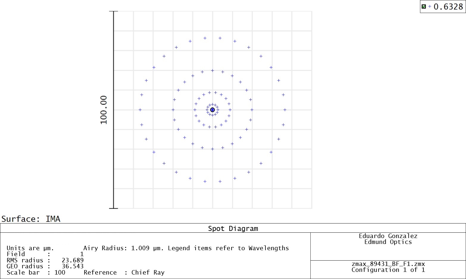 雖然高級非球面透鏡需要更多的時間和設計參與,但與最佳形態非球面透鏡相比的優勢往往是非常值得的。如上所述,最佳形態非球面透鏡往往會與色球差和窄視場相衝突。圖4圖5顯示了兩種設計方法的光斑尺寸比較。高級設計可以減輕這些困擾。高級非球面透鏡的方向允許通過較小的光斑尺寸,因為折射力被分割在兩個表面而不是一個表面。此外,這種方向會導致高級非球面透鏡對光波長的變化不那麼敏感。最後,高級非球面透鏡在處理系統中的離軸光線和未對準方面更勝一籌。相比最佳形態設計,離軸性能更適合這些高級非球面透鏡。然而,儘管高級非球面透鏡優點眾多,但也不乏其缺點。翻轉方向時,性能會變差,並可能發生全內反射。值得慶幸的是,只要熟悉高級非球面透鏡的預期設計並認識到正確方向,就能輕鬆避免這種情況。