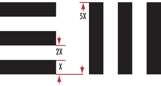 1951 USAF Resolution Targets have been and are currently a standard when considering a target that tests the resolution of an imaging system. They consist of horizontal and vertical bars organized in groups and elements. Each group is composed of six elements, and each element is composed of three horizontal and three vertical bars equally spaced with one another. There can be a total of twelve groups, with larger numbers used for higher resolution. For example, a standard resolution 1951 target consists of group numbers from -2 to 7, whereas a high resolution of -2 to 9; the element number is the same. The resolution is based on bar width and space, where the length of the bars is equal to five times the width of a bar (Figure 7). One Line Pair (lp) is equivalent to one black bar and one white bar. Vertical bars are used to calculate horizontal resolution and horizontal bars are used to calculate vertical resolution.