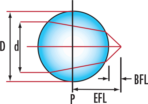 Determine the effective focal length, the back focal length, and the effective numerical aperture of a ball lens based on its diameter, its refractive index, and the diameter of the collimated beam entering or exiting the ball lens. The effective numerical aperture of the application can only be calculated if the user knows the beam diameter. Knowing the numerical aperture is particularly useful when using ball lenses to couple light from a fiber to a laser or to another fiber.
