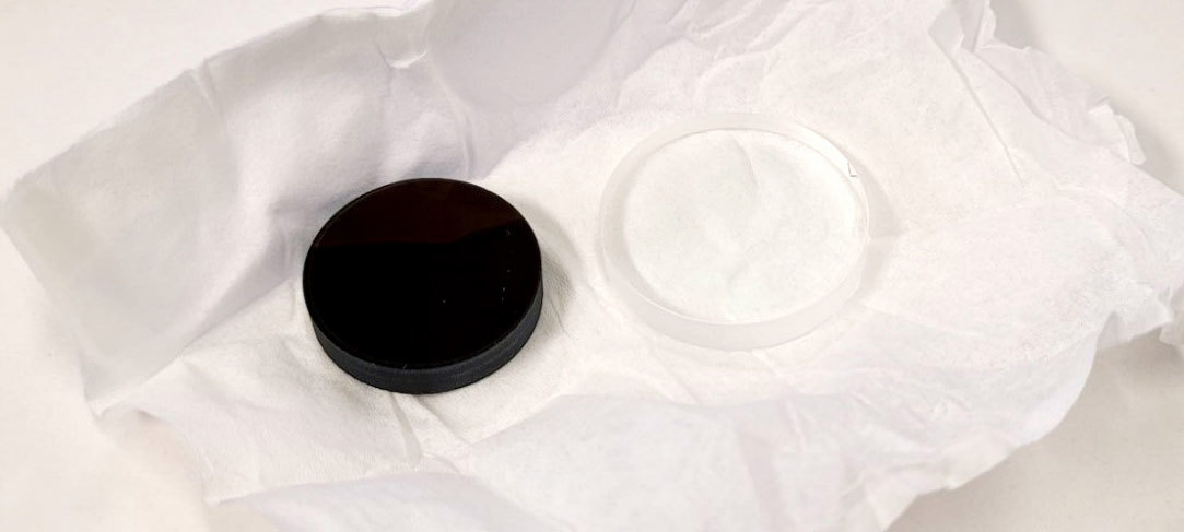 為了評估施瓦茨(Schwarz)反射鏡的性能,我們切割了一個直徑25mm、厚度 5mm 的黑色精密熔融石英毛胚,並對一個面進行了拋光。使用一個輸出功率為500 mW的532 nm二極體泵浦固體(DPSS)連續波雷射器,以及一個能夠以10 nW的解析度測量低至500 nW的矽基光電二極體,對穿過該材料的穿透率進行了測量。沒有檢測到訊號,意味著OD>7。